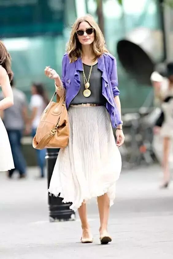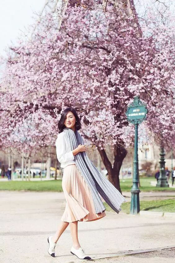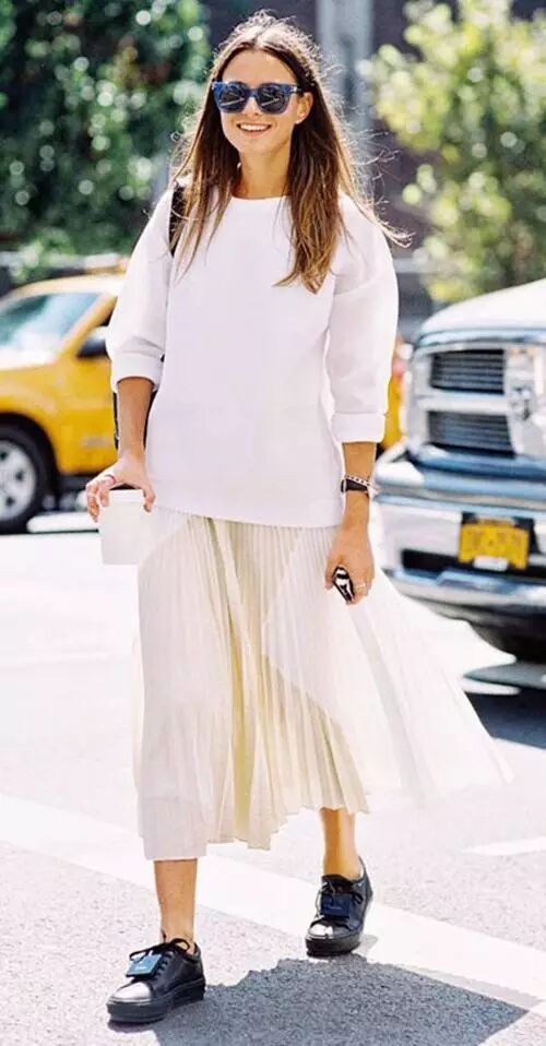 无论是时尚博主,还是ICON,都忍不住选择了飘逸的纯色雪纺长裙亮相活动。春季如果你想要穿风琴裙,那就搭配一件套头小衫吧。