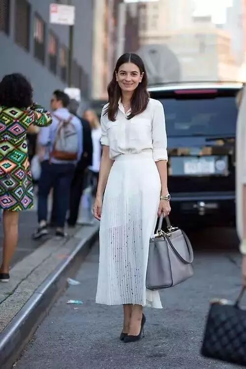 Leila Yavari衬衫配白色过膝风琴裙,一身白色也能穿的非常有气质