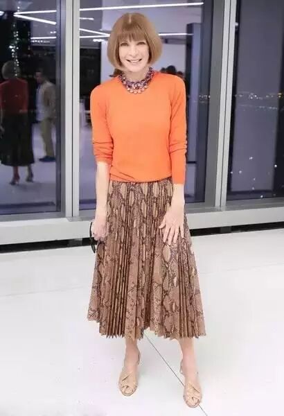 难得见女魔头安娜·温图尔笑着拍照,蟒蛇纹这么难穿的元素,遇到风琴设计也能瞬间收敛,再搭配一双经典裸色鞋,动物纹也能大方优雅。